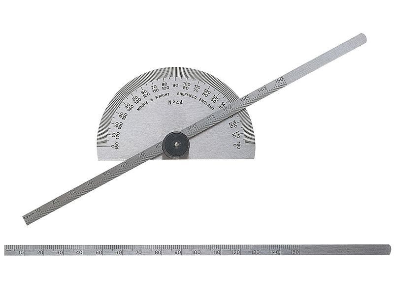 The Moore & Wright Protractor Type Depth Gauge has a full range rule adjustment and the readings can be fixed by means of a locknut. Rules are graduated on both sides.