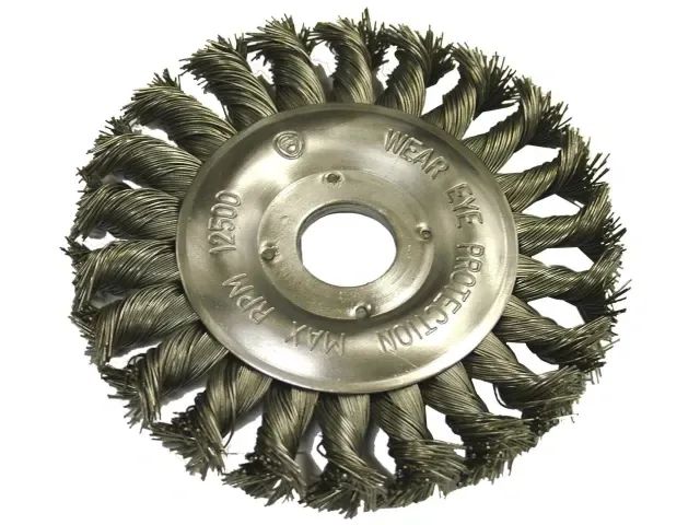 A flat twist knot high tensile steel wire circular brush compatible with 125 mm (5in) angle grinders with a 22.2 mm (7/8in) bore standard angle grinder flange plate. Twist knot brushes are suitable for the removal of slag, rust, scale or even dried cement.