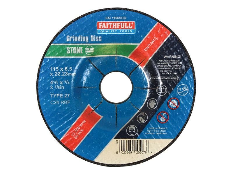 Depressed Centre Stone Grinding Discs are manufactured using Silicone Carbide abrasive grit with fibreglass reinforcing and resin bonded to provide both safety and optimum cutting performance. Use in stock removal applications on stone and concrete. By presenting the disc to the workpiece at an angle of 45º, the most efficient results are achieved. For use with a variety of machines, mini-grinders to stationary cutting-off machines.