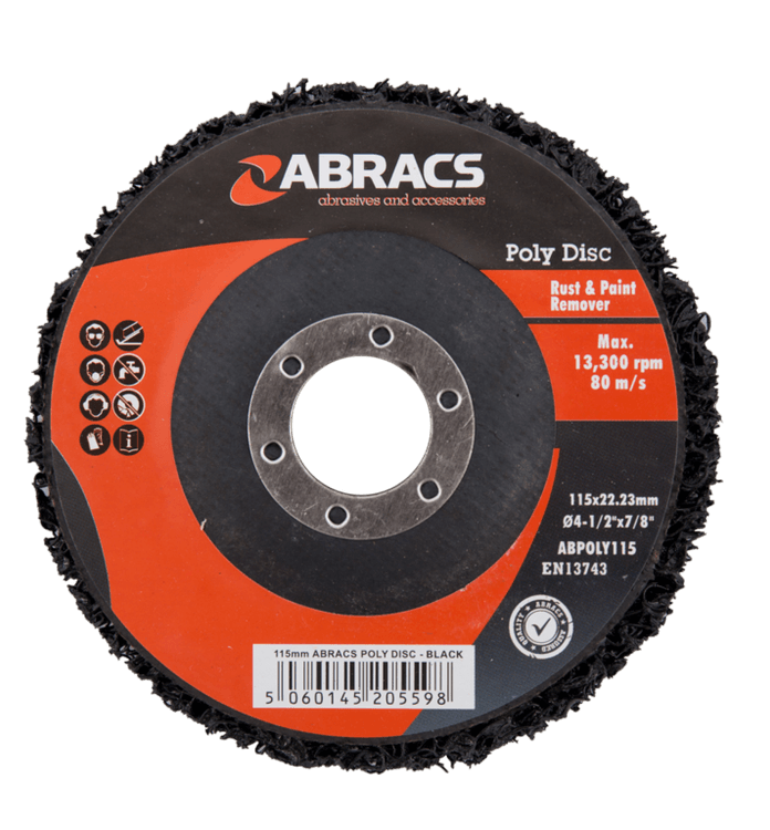 Effortlessly strip away rust and paint. The Abracs ABPOLY115 Rust & Paint Removal Disc is designed for fast, effective surface preparation. Made with durable poly abrasive material, it quickly removes rust, paint, and coatings without damaging the underlying surface.