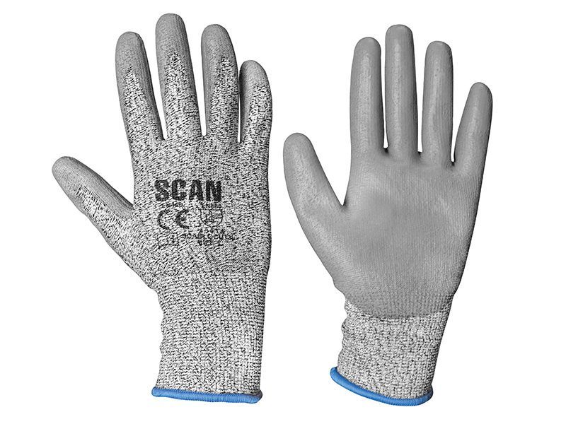 These Scan Grey Polyurethane Coated Gloves are fitted with a 13 gauge, cut 3 resistant, knitted seamless liner. The palms and fingers are coated with polyurethane. They are suitable in cutting environments such as wood and glass, and also suit a laboratory as a protective glove.