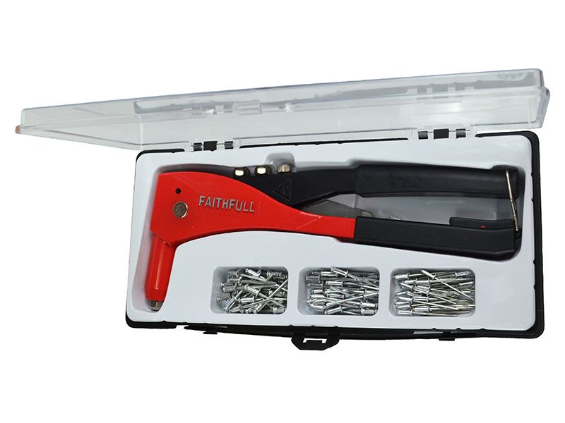 The Faithfull Heavy-Duty Riveter is suitable for single-handed application and provides a rigid permanent fixing. Made from quality steel and fitted with comfortable handles. Supplied with four interchangeable nozzles for most popular rivet sizes.