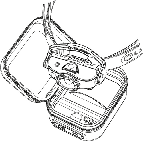 For safe transport/storage of head torch Part No. ERL1H5R. Supplied with USB cable and snap hook.