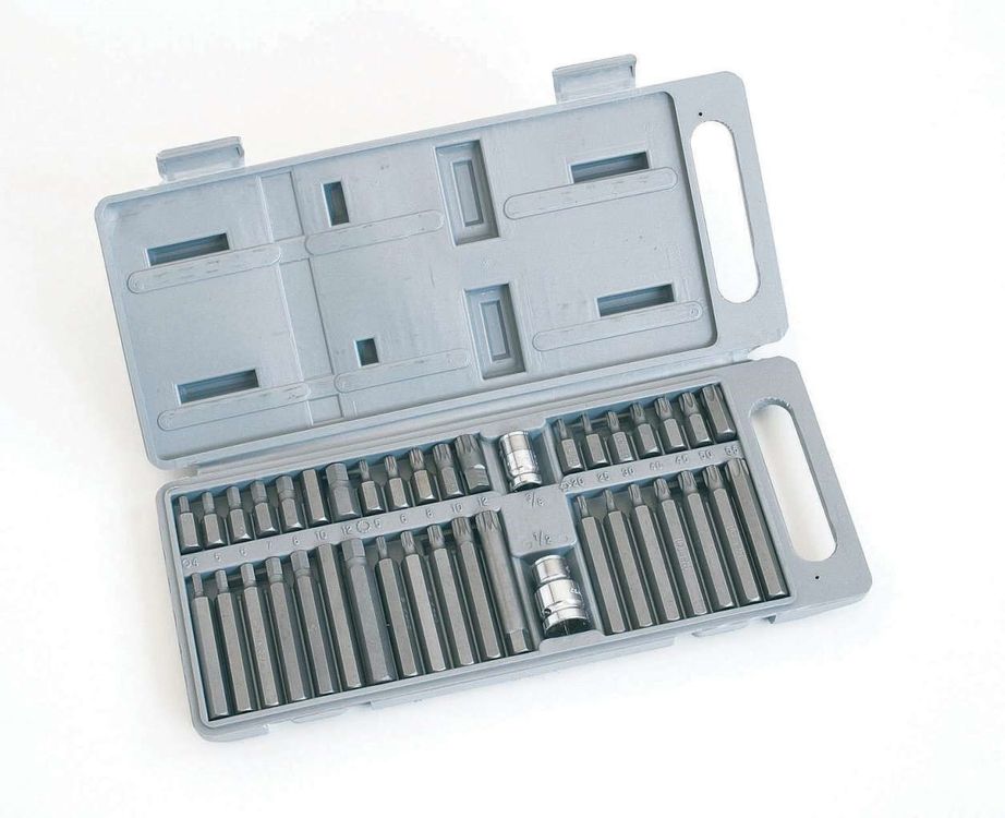Contains: Socket size 3/8" & 1/2" 7 30mm hex bits sizes: 4, 5, 6, 7, 8, 10, 12 7 70mm hex bits sizes: 4, 5, 6, 7, 8, 10, 12 5 30mm spline bites sizes: 5, 6, 8, 10, 12 5 70mm spline bites sizes: 5, 6, 8, 10, 12 7 30mm torx sizes: 20, 25, 30, 40, 45, 50, 55 7 70mm torx sizes: 20, 25, 30, 40, 45, 50, 55