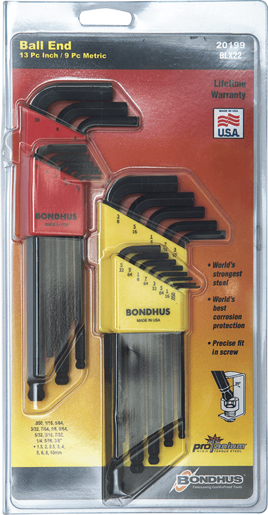 9 x Hex Sizes: 1.5, 2, 2.5, 3, 4, 5, 6, 8, 10 mm.13 x Hex Sizes: .050", 1/16", 5/64", 3/32", 7/64", 1/8", 9/64", 5/32", 3/16", 7/32", 1/4", 5/16", 3/8".