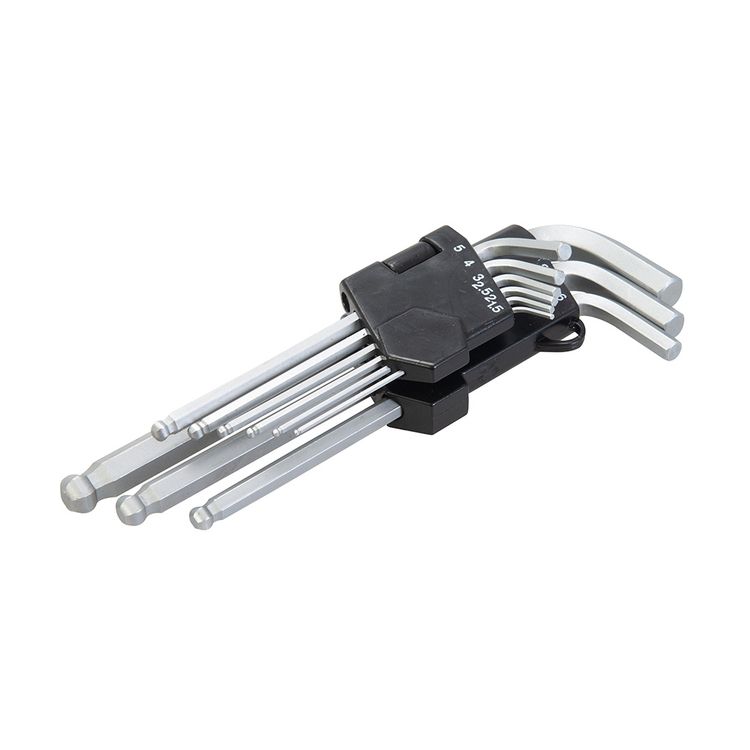 High grade hardened steel with satin plated finish. Ball end provides 15° angled access. Manufactured to DIN911. Includes 1.5, 2, 2.5, 3, 4, 5, 6, 8 and 10mm.