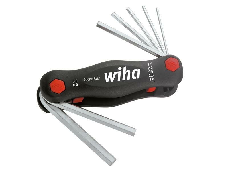 This Wiha PocketStar Hex Key Set has seven hex L-keys made of through hardened, Chrome-vanadium steel with an electro-plated finish. Stored in a handy, space-saving folding holder.