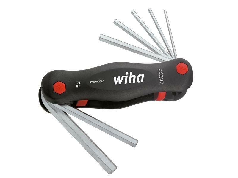 This Wiha PocketStar has seven hex L-keys made of through hardened, Chrome-vanadium steel with an electro-plated finish. Stored in a handy, space-saving folding holder.