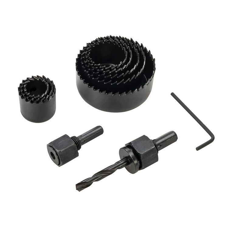High carbon steel body with heat-treated teeth. For timber, plasterboard, plastics and non-ferrous metals. Includes 8 x holesaws: 19, 25, 29, 32, 38, 44, 51 and 64mm dia, 2 x arbors and 1 x 2.5mm hex key. Compatible with chucks up to 13mm.