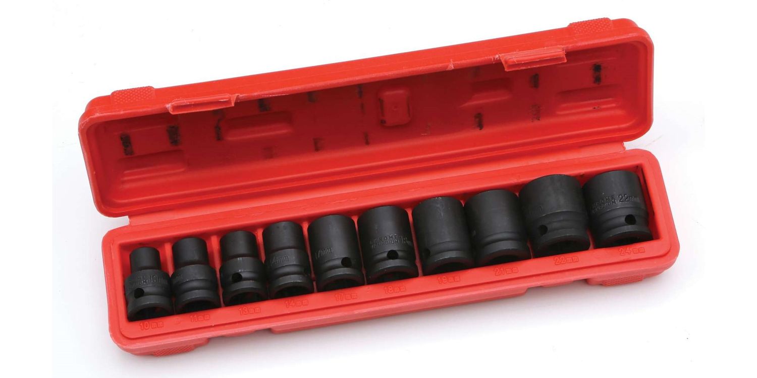 Chrome vanadium steel fully heat treated deep impact sockets. Black finish with groove and hole for retaining ball or ring. 10 x 6 point pro drive sockets sizes 10, 11, 13, 14, 17, 18, 19, 21, 22, 24mm.