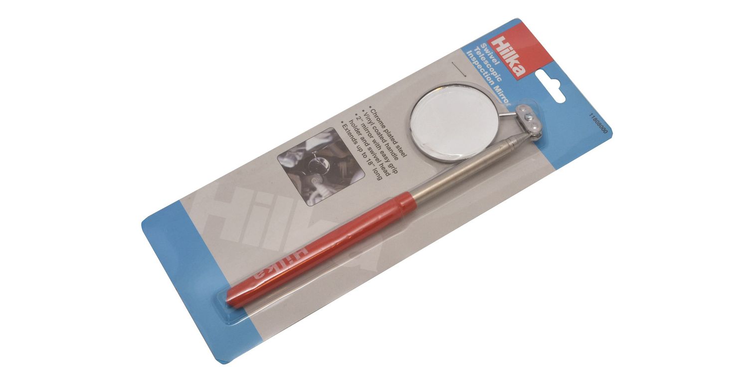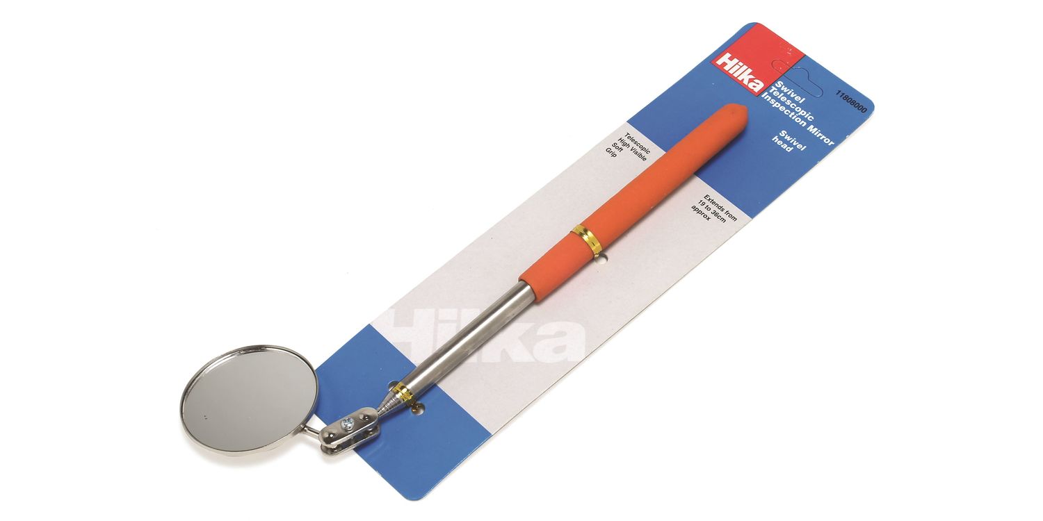 Chrome plated steel with vinyl coated handle. 2" mirror with easy grip handle and swivel head. Extends to 18" (460mm). Great for viewing difficult to reach areas.