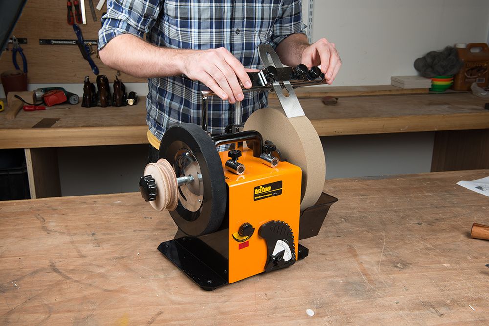Plane Camber Jig for use with the Triton Whetstone Sharpener TWSS10. Especially good for scrub and jack plane irons. Puts an even, slight radius onto a hand plane iron. Camber for improved shearing action.