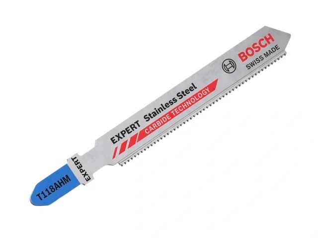 The Bosch EXPERT Stainless Steel Jigsaw Blade for Thin Material comes in two versions: the T118 AHM for very thin sheets has a very fine tooth pitch; the T118 EHM with medium-fine teeth is therefore the best buy for professionals cutting thin sheets of the highest strength steel or pipes with medium to thin walls.