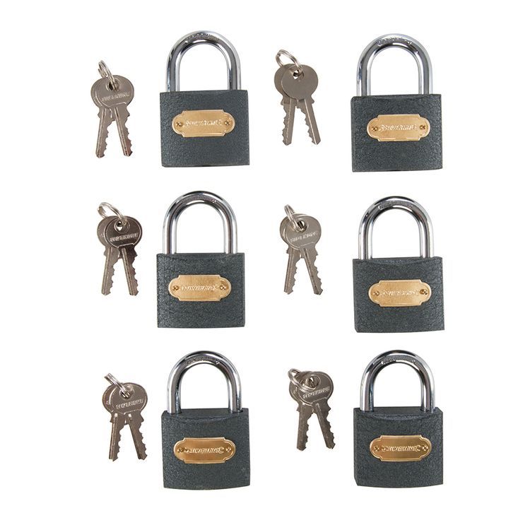 Heavy duty iron body with brass cylinder and chrome-plated, hardened steel shackle. Multi-pin tumbler mechanism. Each padlock is supplied with 2 x keys. All keys fit any of the padlocks. Includes 12 x steel keys. Horizontal x vertical shackle clearance: 26 x 26mm. Shackle dia: 7.9mm.