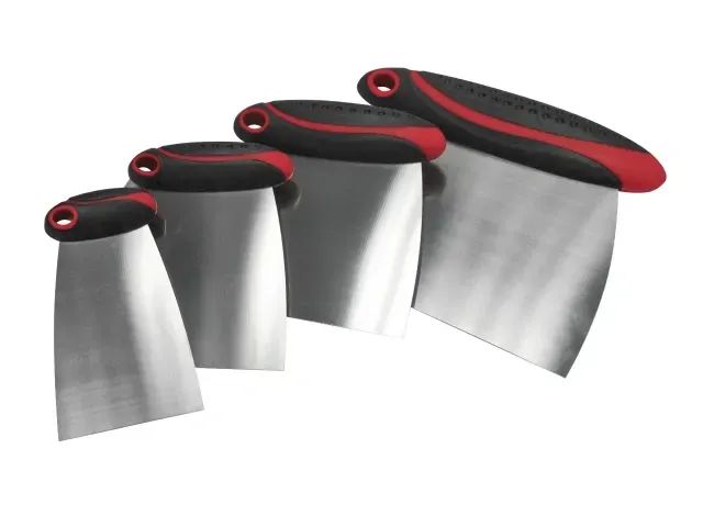 Faithfull 4 piece Filler & Spreader Set for applying and finishing fillers. Fitted with flexible stainless steel blades and a soft grip, solvent resistant handles. The wide handle style provides a firm grip and aids in applying an even pressure across the blade to provide a smooth even finish. They also feature a handy hanging hole.