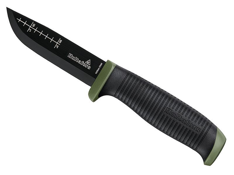 The Hultafors OK1/OK4 Outdoor Knives have a scandi grind and are made from Japanese knife steel 3.0mm carbon steel that has been hardened to 58–60 HRC. It has a rust protective, electrophoretic deposition coating to withstand corrosion. The ground spine of the blade is designed for starting a fire with a fire starter and there is scale engraved on blade for optimised outdoor usage.