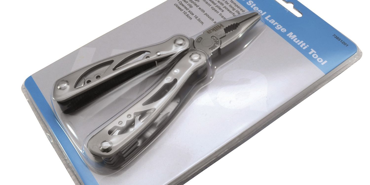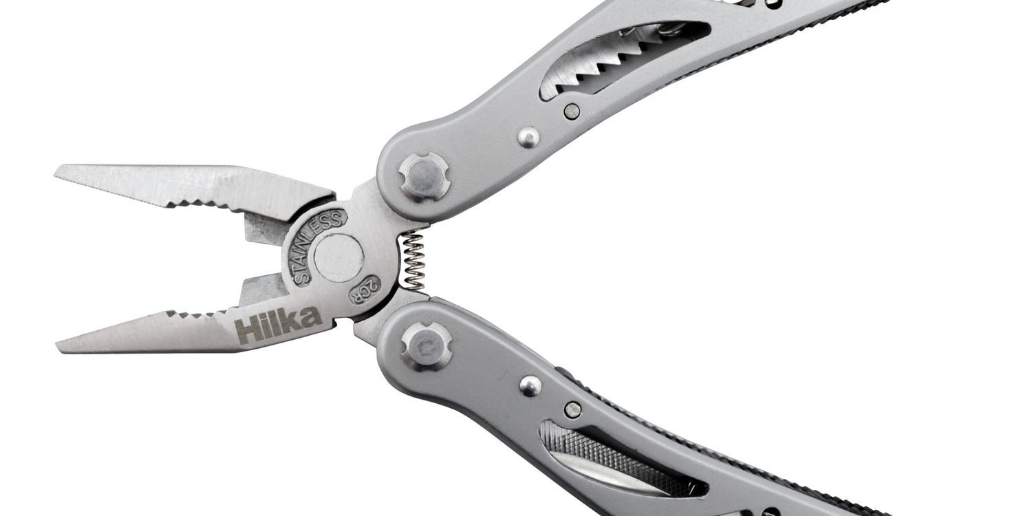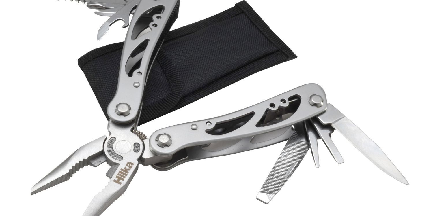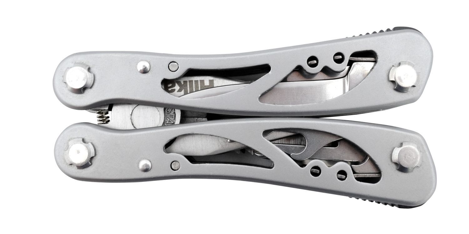Hardened and tempered stainless steel for long life. 12 in 1 tool with powerful spring loaded pliers and convenient open frame design. Supplied with pouch and belt clip. Opened size 16.5cm, closed 10.6cm. Includes: Universal pliers with serrated noses, wire cutter, saw, small and large knife, 2x bottle opener, 2x flat head screwdrivers, phillips screwdriver, fine and course file.