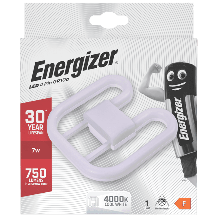 • The Energizer 7W 4-PIN LED Lamp GR10q 750lm, 4000K, is a high-efficiency 2D-style LED lamp designed for use in bulkhead fittings and similar enclosed luminaires.