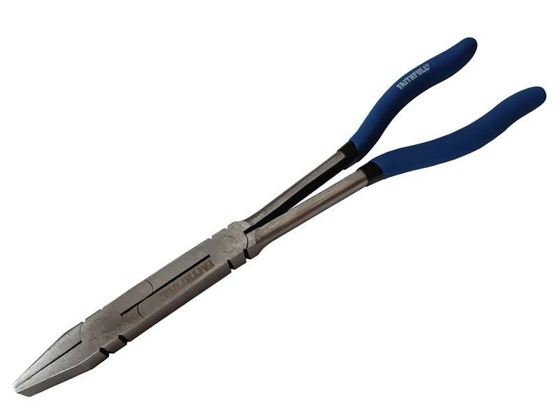 Faithfull Long Reach Flat Nose Pliers are excellent for access into tight locations. A double-jointed compound action allows the jaws to open with minimal handle movement. These extra-long pliers feature a flat nose design with serrated jaws to maximise grip.