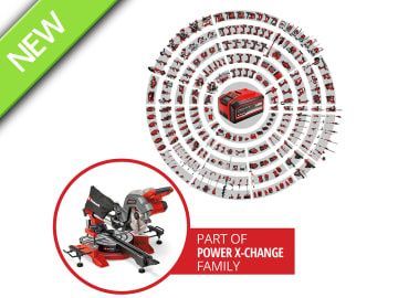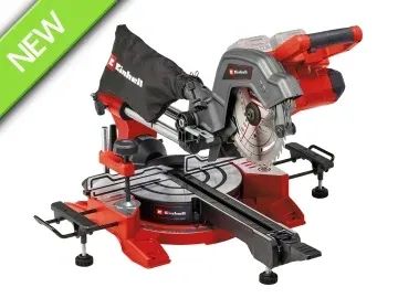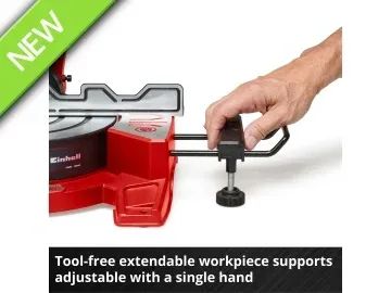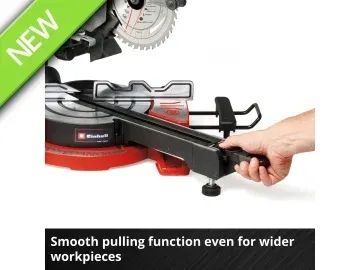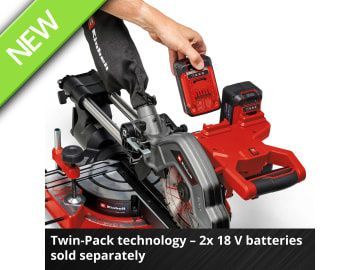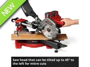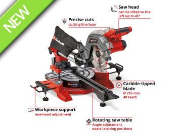 The Einhell TE-SM 36/8 L Li-Solo Sliding Mitre Saw has a powerful 36V motor and with an idle speed of 3,000 rpm, the robust 40-tooth, Ø 216mm carbide-tipped saw blade works quickly and cleanly through the material. The rugged saw has a smooth sliding function for wide workpieces. This enables a cutting width of max. 305mm and a cutting depth of max. 65mm.