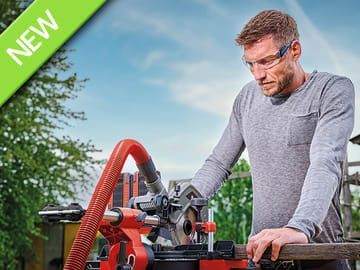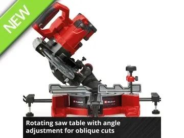 Precise angle adjustment on the turntable facilitates the desired angled cuts. The rotating table has positions to lock it in place at the most common angles, which can be clearly read from the angle scale. Angle adjustment up to 47° to the left and right facilitates quick adjustment. The saw head can also be tilted up to 45° to the left with a quick adjustment and thus ensures a flexible and almost freely selectable mitre cut.