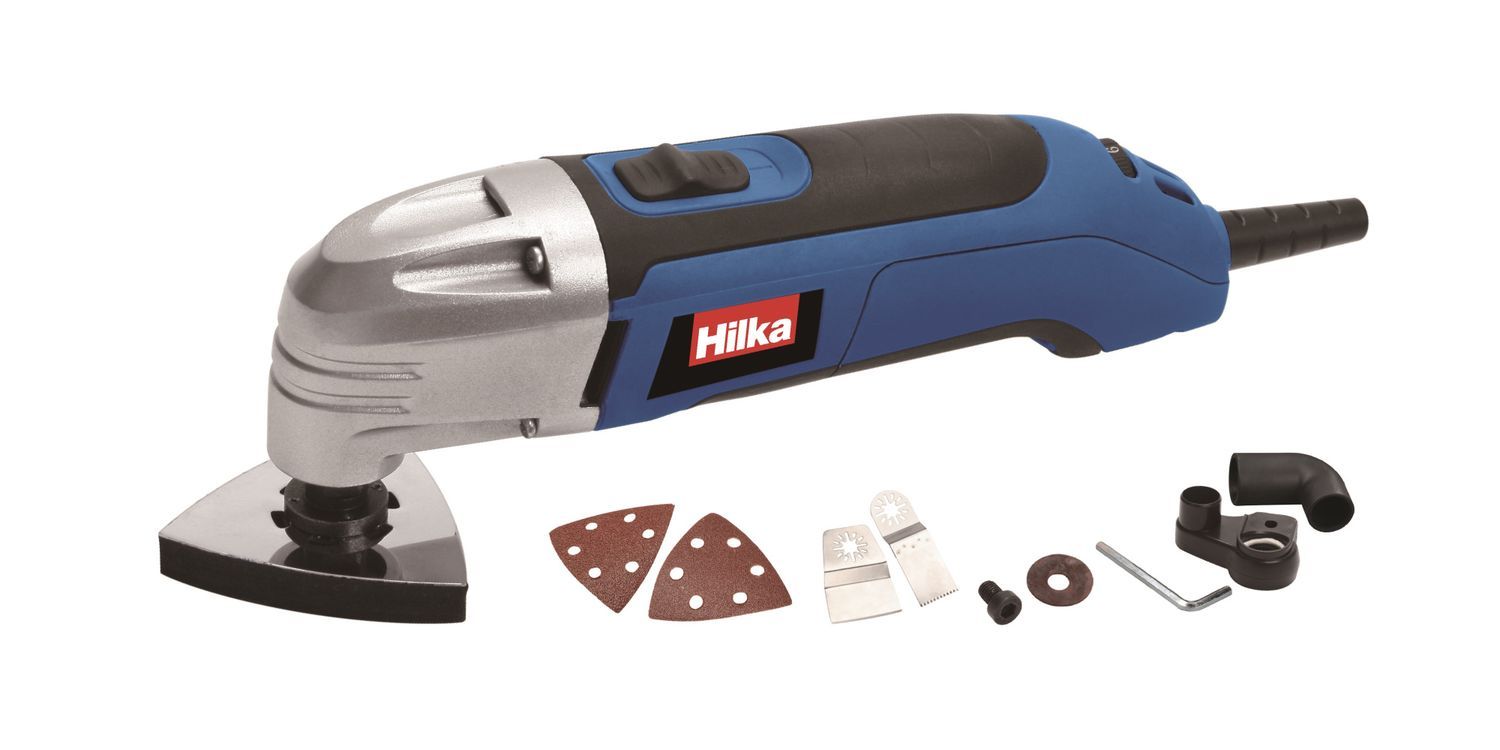 Powerful, oscillating multi-function tool with variable speed for cutting, sanding, scraping and more. Dust extraction facility with soft grip handle. Ideal for use on wood, plastic, metal, tiles, plaster and pipes. Supplied with cutting blade, scraper, dust extractor, triangular sanding pad and two sanding sheets. Input power: 300w. Oscillation speed: 15,000-22,000 per minute. Oscillation angle: 3 degrees.