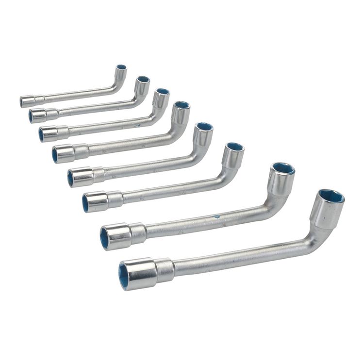 Compact metric L-shaped double-end socket wrench. Go-through short end. 6-point socket head.