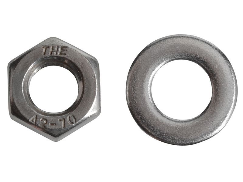 These Hexagon Nuts and Washers are made from A2 stainless steel. The hexagonal shape of the nut is designed to be driven by a wrench (spanner) and provides excellent torque when done so. The washer distributes the load of the nut and helps to reduce vibration.