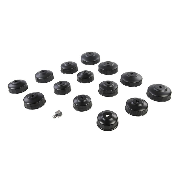 Chrome vanadium steel cup-type sockets with anti-rust, electro-black oxide finish. For removing and installing different sized oil filters on various vehicle models. Socket-like grip minimises risk of crushing filters. For use with 3/8 or 1/2" square drive wrenches. Includes 36 face cup (93mm), 30 face cup (76mm), 7 x 15 face cups (74/76, 75/77, 80, 80/82, 90, 93 and 100mm), 1/2 - 3/8" adaptor and tough storage case.