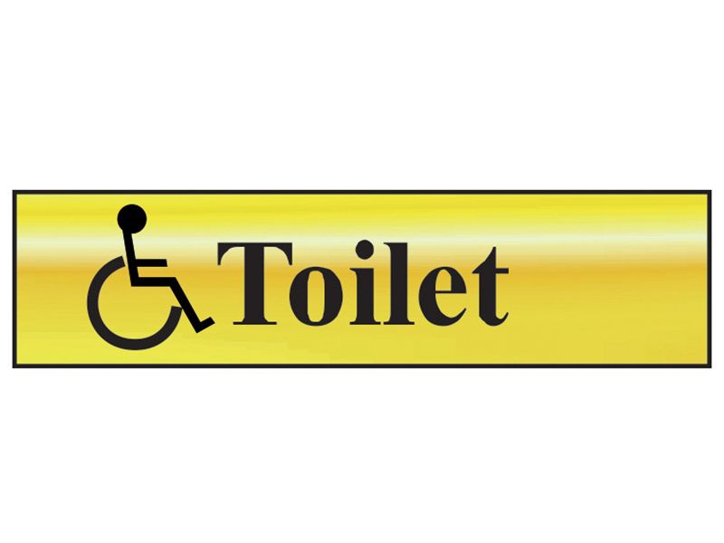 Scan polished brass effect self-adhesive bathroom sign with black text/graphic. Printed using UV resistant inks.