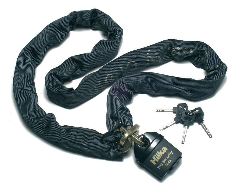 10mm x 1 metre hardened square steel chain and padlock. Provides maximum protection with long lasting security and resistant to bolt cutters, hammers, saws and chisels. Protective textile outer sleeve protects paintwork and rim. Narrow inner width of links defends against leverage attacks with closed shackle padlock for added protection with 4 keys.