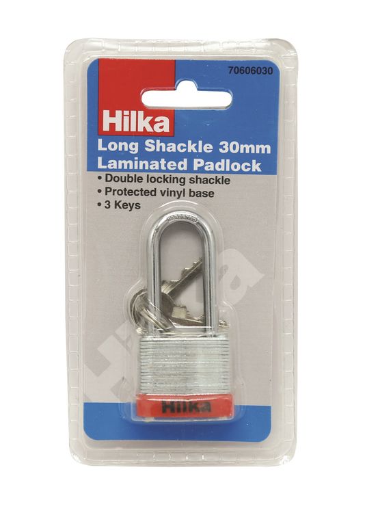 Strong double locking shackle with laminated steel body and protective vinyl bumper. Suitable for indoor use and supplied with 3 keys.