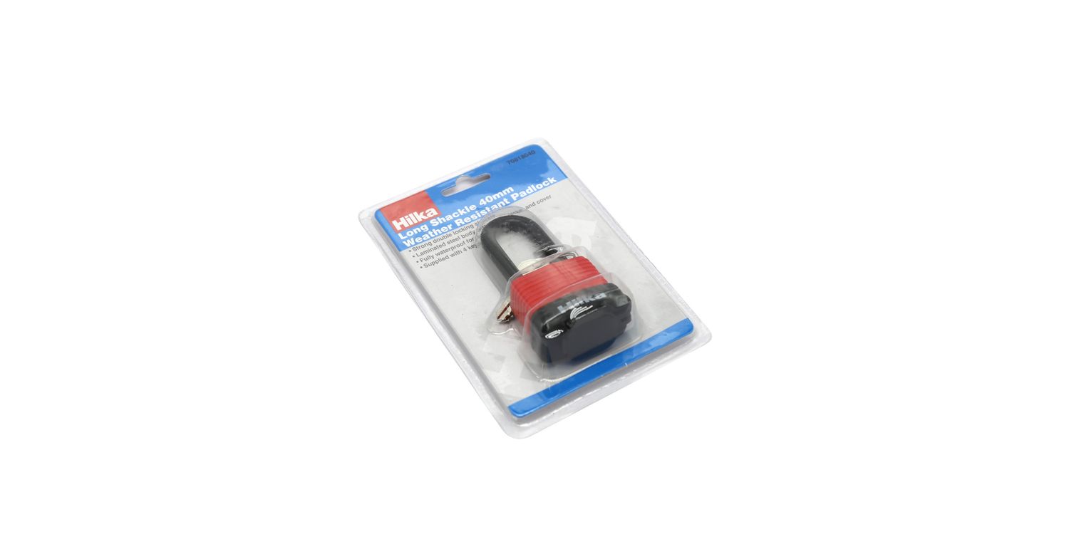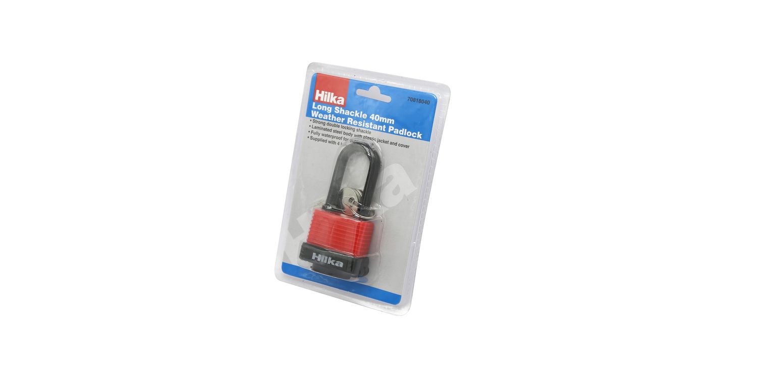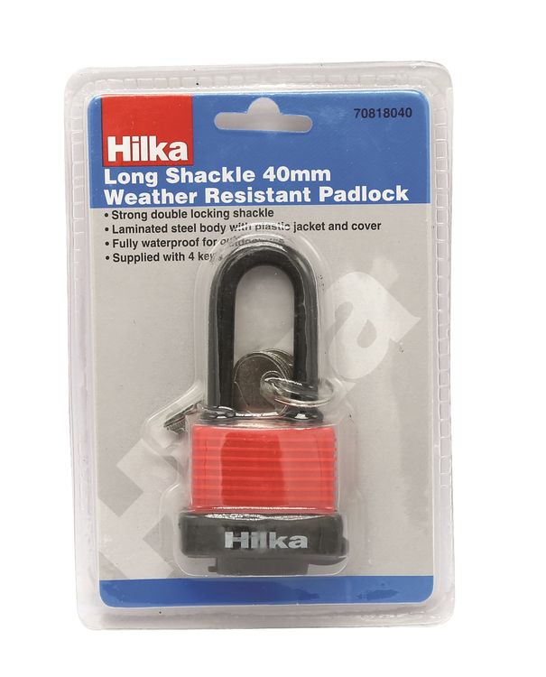 Strong double locking shackle. Laminated steel body with plastic jacket and cover. Fully waterproof for outdoor use and supplied with 4 keys.