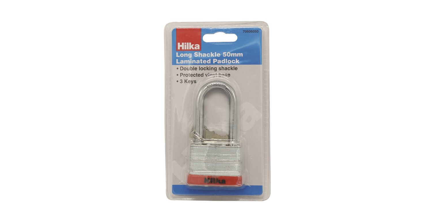 Strong double locking shackle with laminated steel body and protective vinyl bumper. Suitable for indoor use and supplied with 3 keys.