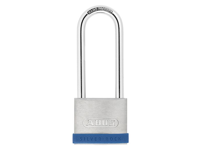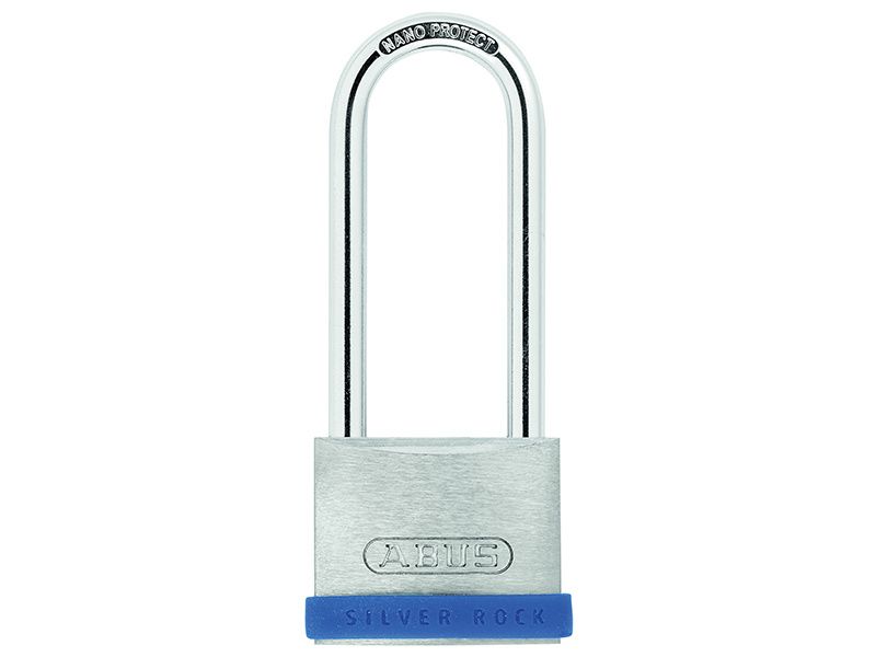The ABUS Silver Rock™ 5 Padlock has a stable lock body made from zinc with a brushed stainless steel look. Fitted with a high-security, heavy zinc shackle and a blue plastic bumper for protection against scratching of protected surfaces. For increased protection there is a precision 5-pin cylinder with paracentric key profile and a Nano Protect™ bolt.