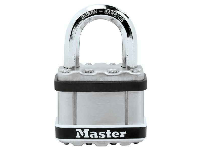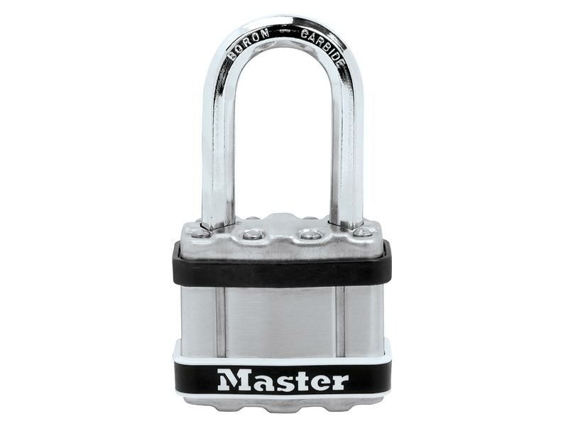 The Master Lock Excell™ Laminated Stainless Steel Padlock has a laminated steel body encased in a stainless steel body cover for maximum strength and weatherability. Its octagonal shackle is made of chrome-plated boron carbide, 50% harder than hardened steel, offering maximum resistance to cutting and sawing. The 4-pin cylinder prevents picking and the dual locking ball bearings provide maximum resistance against prying and hammering.
