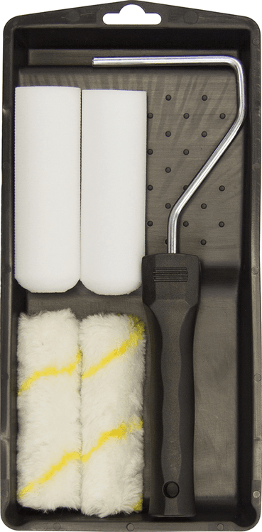 Kit contains: 1 x 4" Roller Frame, 4" Paint Tray. 2 x Roller Refills: Medium Pile, Smooth Foam.
