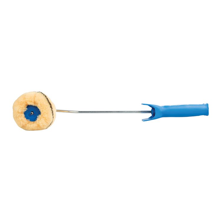 Woven acrylic roller with long-handled frame and 12mm pile corner sleeve. Allows neat paint application in tight spaces. Ideal for use in corners and painting around pipework. Suitable for solvent or water-based emulsion, wood treatments and undercoats. For use on smooth and semi-rough surfaces.