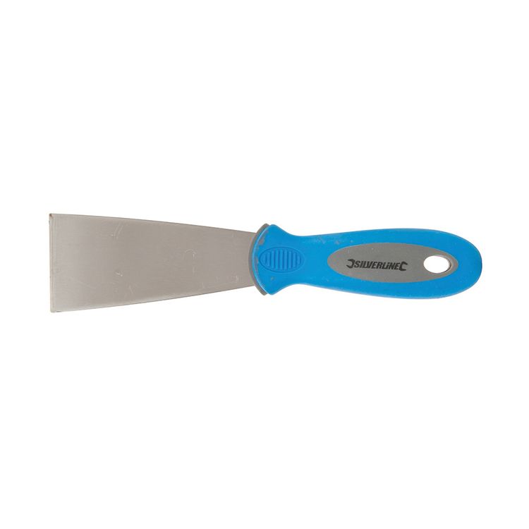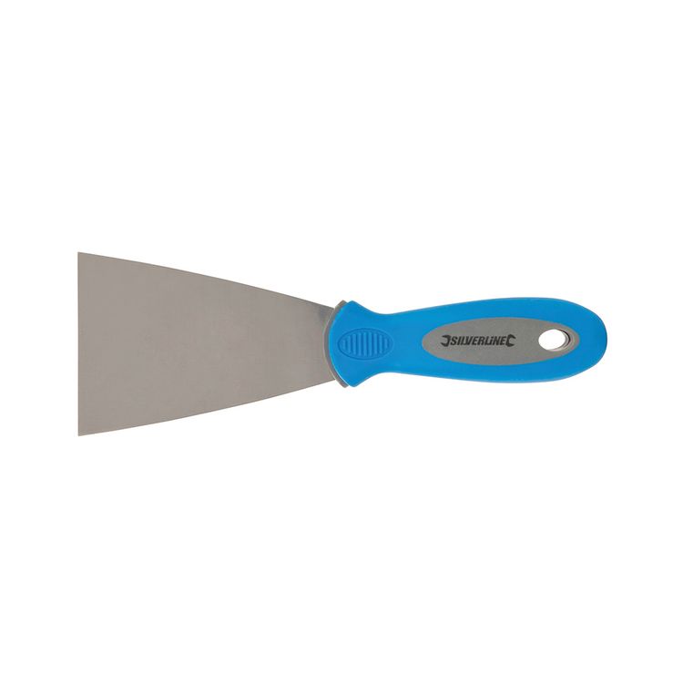 Premium-quality scraper knife with corrosion-resistant spring-tempered steel blade and two-tone soft-grip handle. Hanging hole.