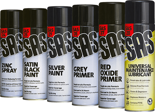 6 x 500ml Aerosols: Zinc Spray, Satin Black Paint, Silver Paint, Grey Primer, Red Oxide Primer, Universal Maintenance Lubricant.