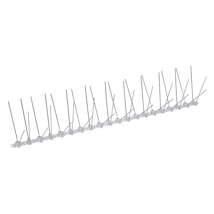 Polycarbonate base with stainless steel spikes. Can be attached to wooden or concrete surfaces using pre-drilled holes or to plastic surfaces with double-sided adhesive or suitable glue (not included). Prevents birds from landing on buildings and fences. Width 50mm. Spike length 105mm.
