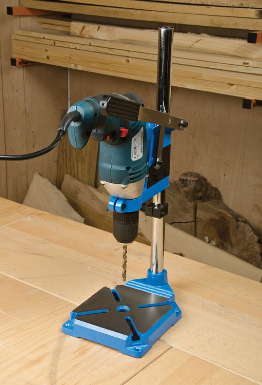 For use with hand-held electric drills with collar diameter of 43mm (or 38mm with supplied reducing bush). Drilling depth up to 60mm. Cast iron base with fixing points. Features depth adjustment scale and stop.