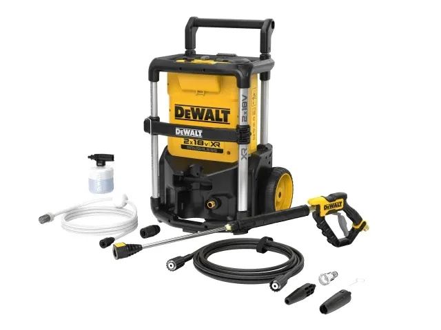 The DEWALT DCMPW1600 XR Pressure Washer is powered by 2 x 18V XR Li-ion batteries (NOT SUPPLIED). Its powerful 36V brushless motor allows the washer to deliver three operating modes, Low (70 Bar), High (80 Bar) and a Boost Mode (110 Bar). These modes increase the intensity of the flow of water from the source. In Boost mode, the pressure washer will allow a maximum of 8mins at 110Bar before reverting to the previously selected mode.