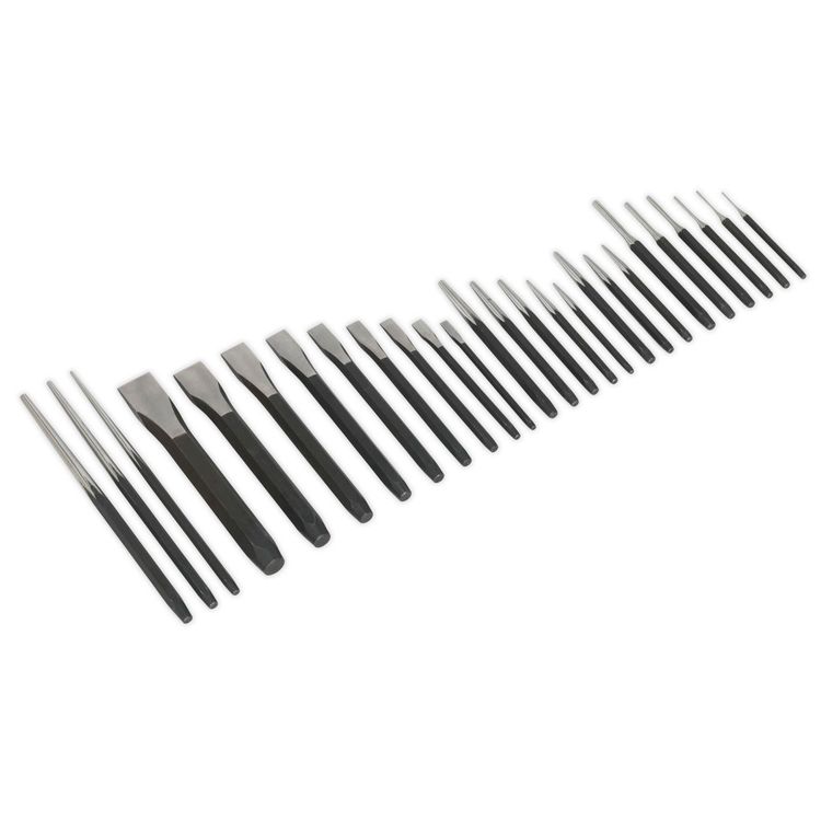 | Contents | Pin Punches; Ø2 x 114, Ø2.5 x 127, Ø3 x 133, Ø4.5 x 146, Ø5 x 152, Ø6.5 x165mm, Centre Punches; Ø3 x 124, Ø4 x 127, Ø5 x 143mm, Taper Punches; Ø2.5 x 114, Ø3 x 127, Ø3 x 257, Ø5 x 140, Ø5 x 257, Ø5.5 x 152, Ø6.5 x 165, Ø6.5 x 257mm, Cold Chisels; 8 x 133, 9.5 x 146, 11 x 159, 13 x 171, 16 x 184, 19 x 197, 22 x 203, 25 x 205, 30 x 216mm |