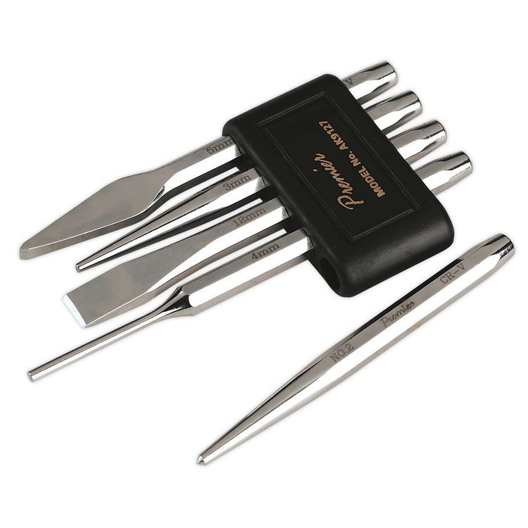 | Contents | Ø4 x 9.5 x 120mm Centre Punch, Ø4 x 9.5 x 120mm Taper Punch, Ø4 x 9.5 x 150mm Parallel Pin Punch, 12 x 9.5 x 130mm Cold Chisel, 5 x 9.5 x 130mm Utility Chisel |
