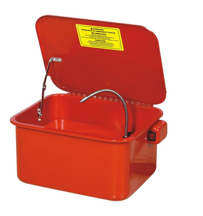 Bench top parts washer with 3.5-gallon solvent capacity, re-circulation pump and safety cut out. Has pump rate of 30 gallon per hour and removable parts shelf with a flexible hose. Product weight 7.5kg.