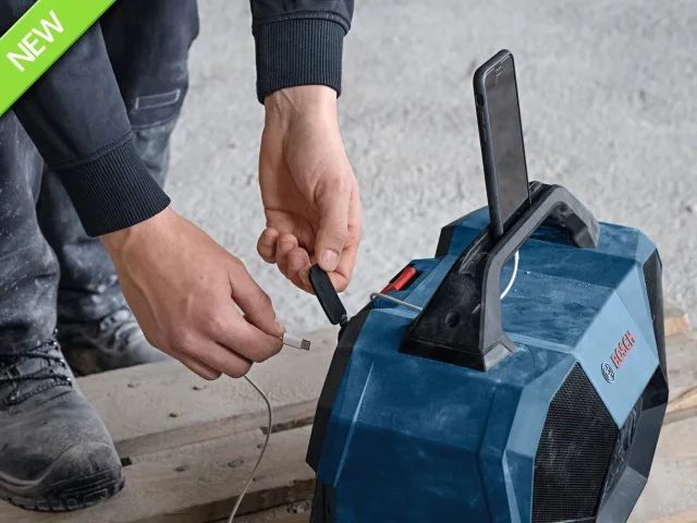 The jobsite speaker is IP54-protected when running on battery with all compartments closed and can be powered with a USB power supply with power delivery (PD). You can also position your smartphone on the handle. Includes a USB port for charging smartphones.
