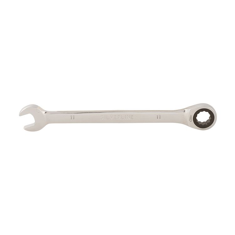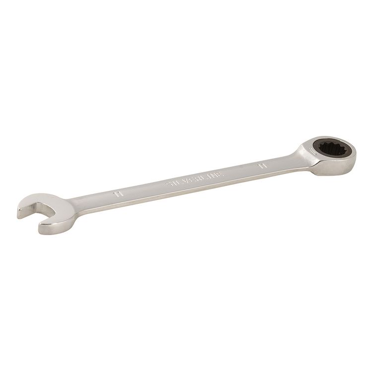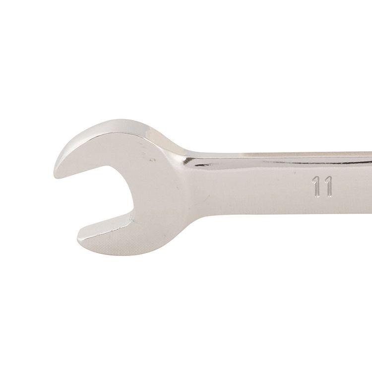 Hardened and tempered chrome vanadium metric spanner with mirror-polished finish. Chrome plated for corrosion resistance. 5° ratchet action. Provides easy access in tight spaces.