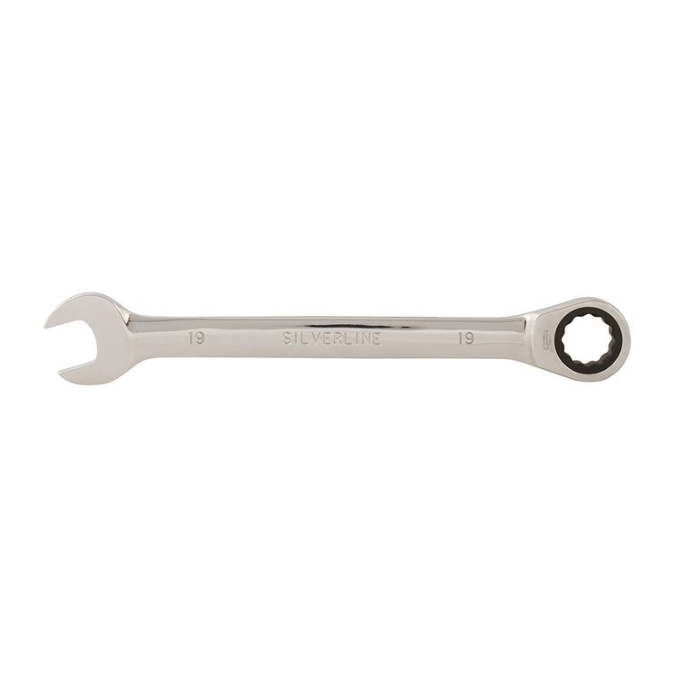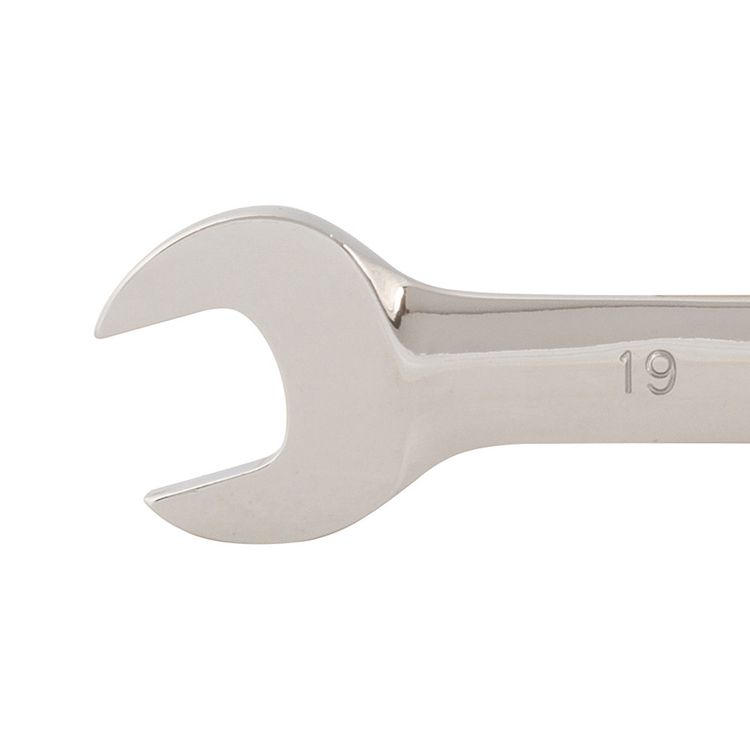 Hardened and tempered chrome vanadium metric spanner with mirror-polished finish. Chrome plated for corrosion resistance. 5° ratchet action. Provides easy access in tight spaces.