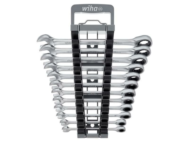 The Wiha Ring Ratchet Spanner Set, 12 Piece, is made from high-quality, chrome vanadium steel with a corrosion-resistant and easy-to-clean surface.